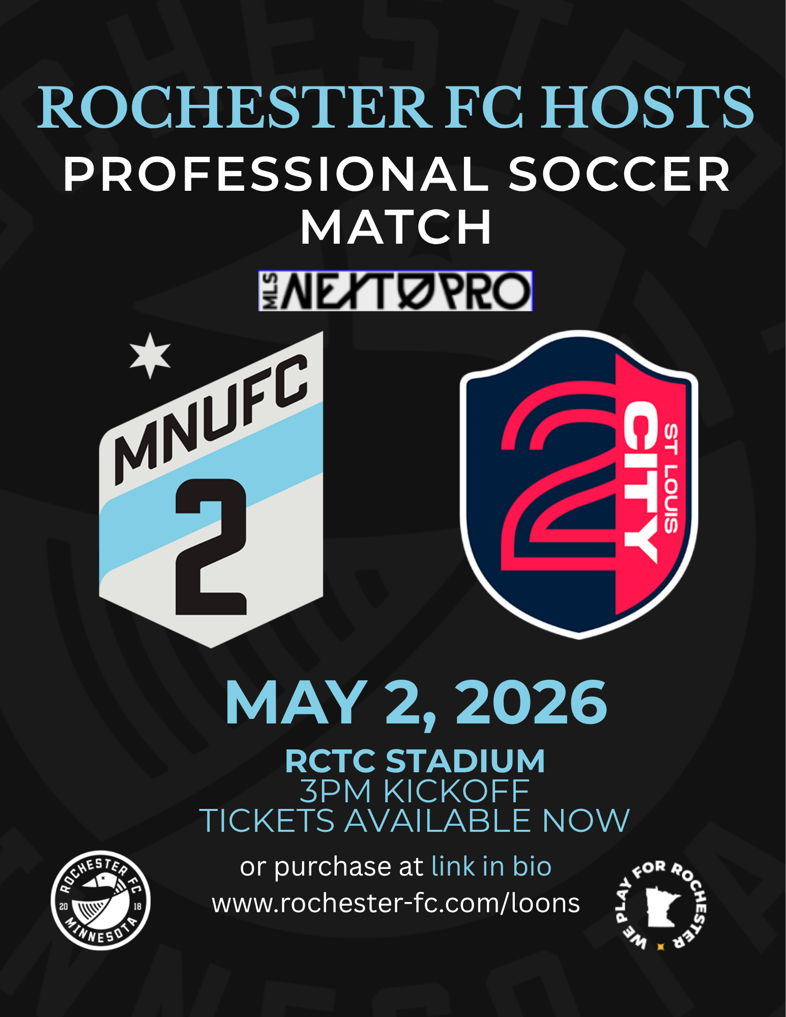 next match - may 2nd as we host mnufc 2 at rochester, mn